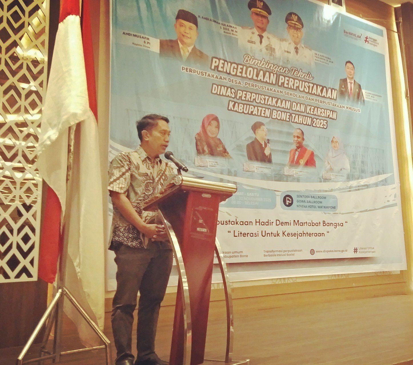 RKN-NEWS.COM–Dinas Perpustakaan dan KearNsipan (Dispeka) Kabupaten Bone, Sulawesi Selatan gelar Bimbingan teknis (bimtek) di Hotel Novena Jumat 21 November 2025 yang dihadiri sekira 400an peserta dari pengurus Perpustakaan desa, Perguruan tinggi, pengurus perpustakaan Masjid, Lapas dan perpustakaan Sekolah Dasar serta Perpustakaan SMP.